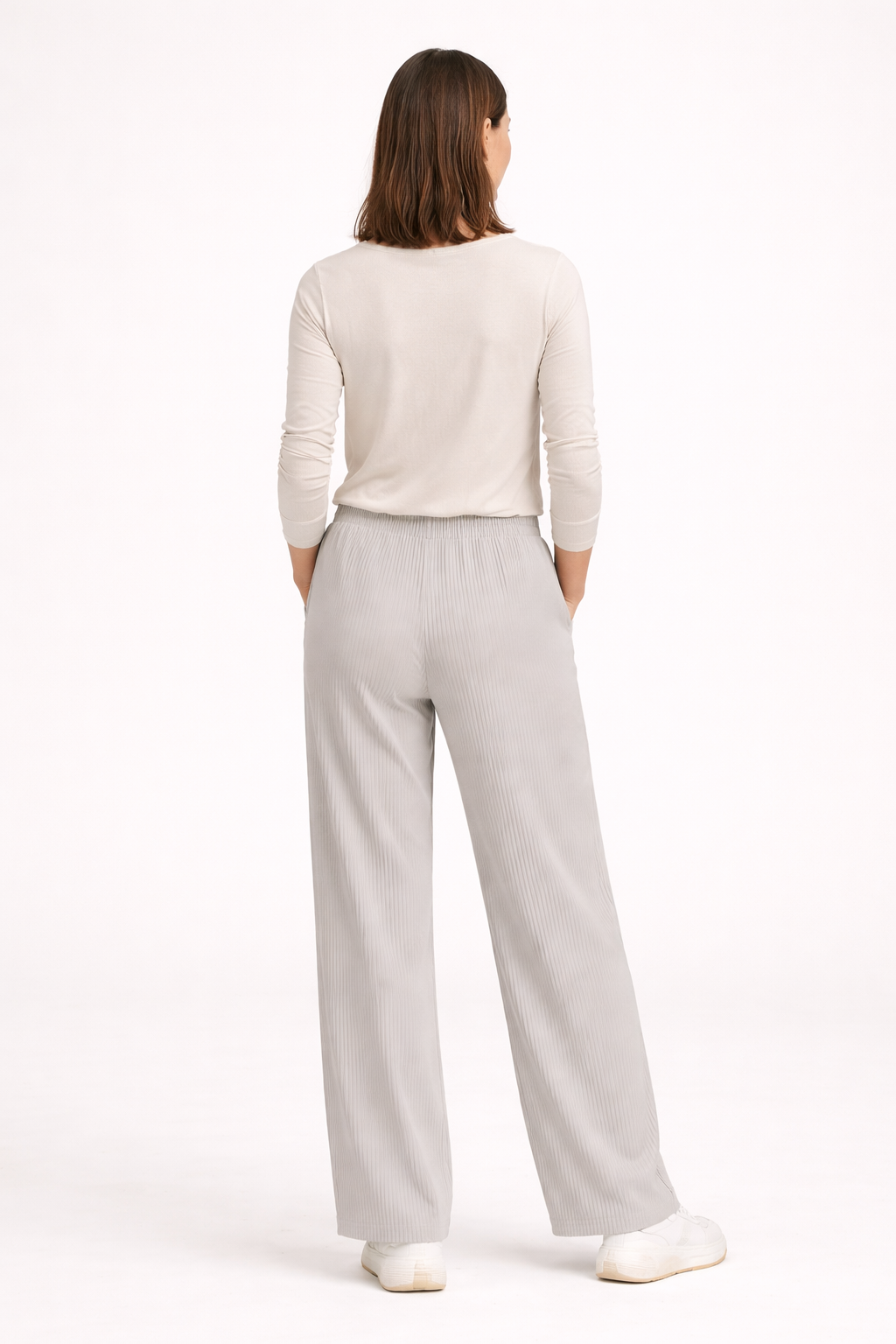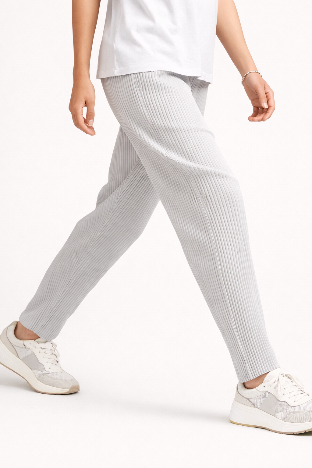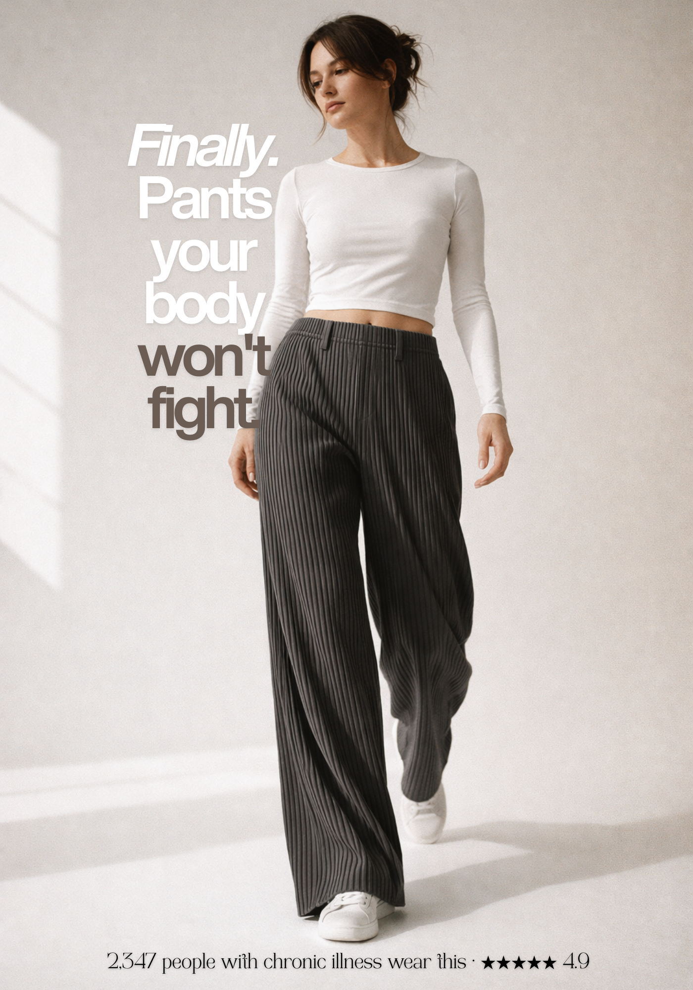 Miyake-inspired pleated fabric. You leave the house looking put-together — not like you grabbed what hurts least. Because you shouldn't have to choose.