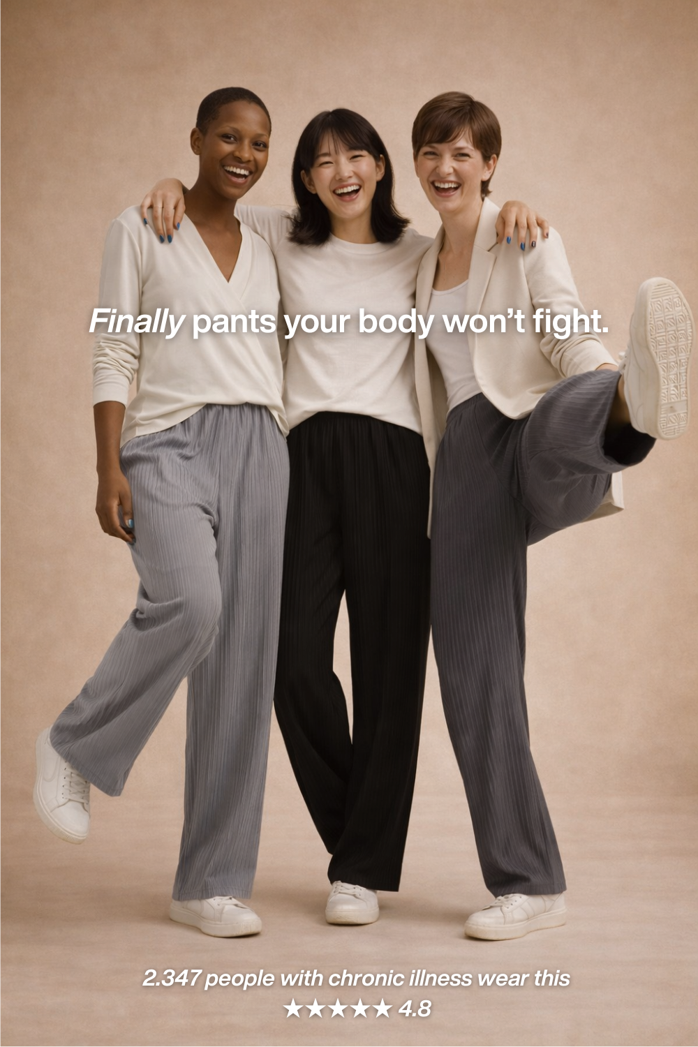 "I don't have a chronic illness — I just hate uncomfortable clothes. Found these through a friend. Best trousers I've ever owned."